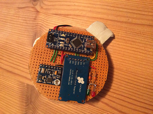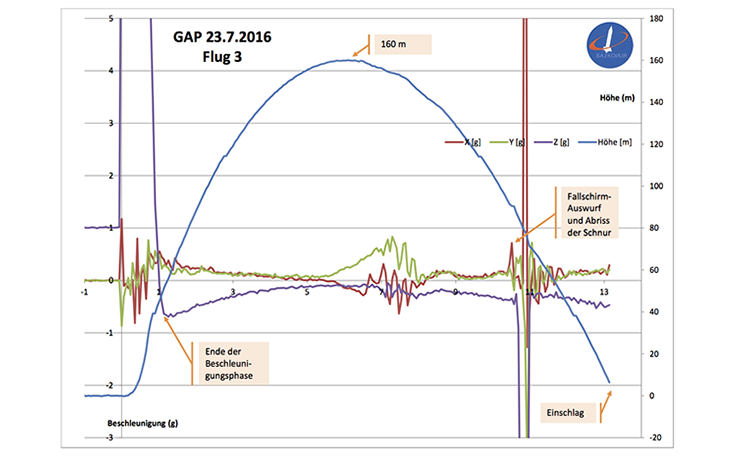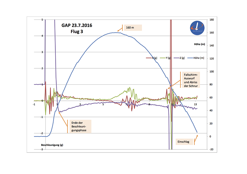 Am 6. 5. 2016 konnten wir dank Michael unseren selbstgebauten Datenlogger in Betrieb nehmen. Neben der Höhe (über Drucksensor) werden die Beschleunigung in alle 3 Achsen und Gyro-Werte aufgezeichnet. Verwendet haben wir ein Arduino Nano Board ATMEGA als Rechner, als Sensor den GY-86 10 DOF MPU6050+ HMC5883L+ MS5611 Flight Controller. Die Datenaufzeichnung erfolgt mit einem TF MicroSD Card Module. Alle Module zusammen liegen bei ca. 30 Euro; je nach Bezugsquelle geht es auch noch günstiger. Die Software hat Michael so implementiert, dass die Messwerte kontinuierlich auf die MicroSD geschrieben werden. Gemessen werden die Werte ca. alle 60 msek. Leider fiel MF01 schon am 23. 7. 2016 unserem ersten Absturz zum Opfer (siehe Starttag 6). Der Flugverlauf (siehe Bild) wurde, dank kontinuierlicher Aufzeichnung bis zum Einschlag komplett aufgezeichnet.